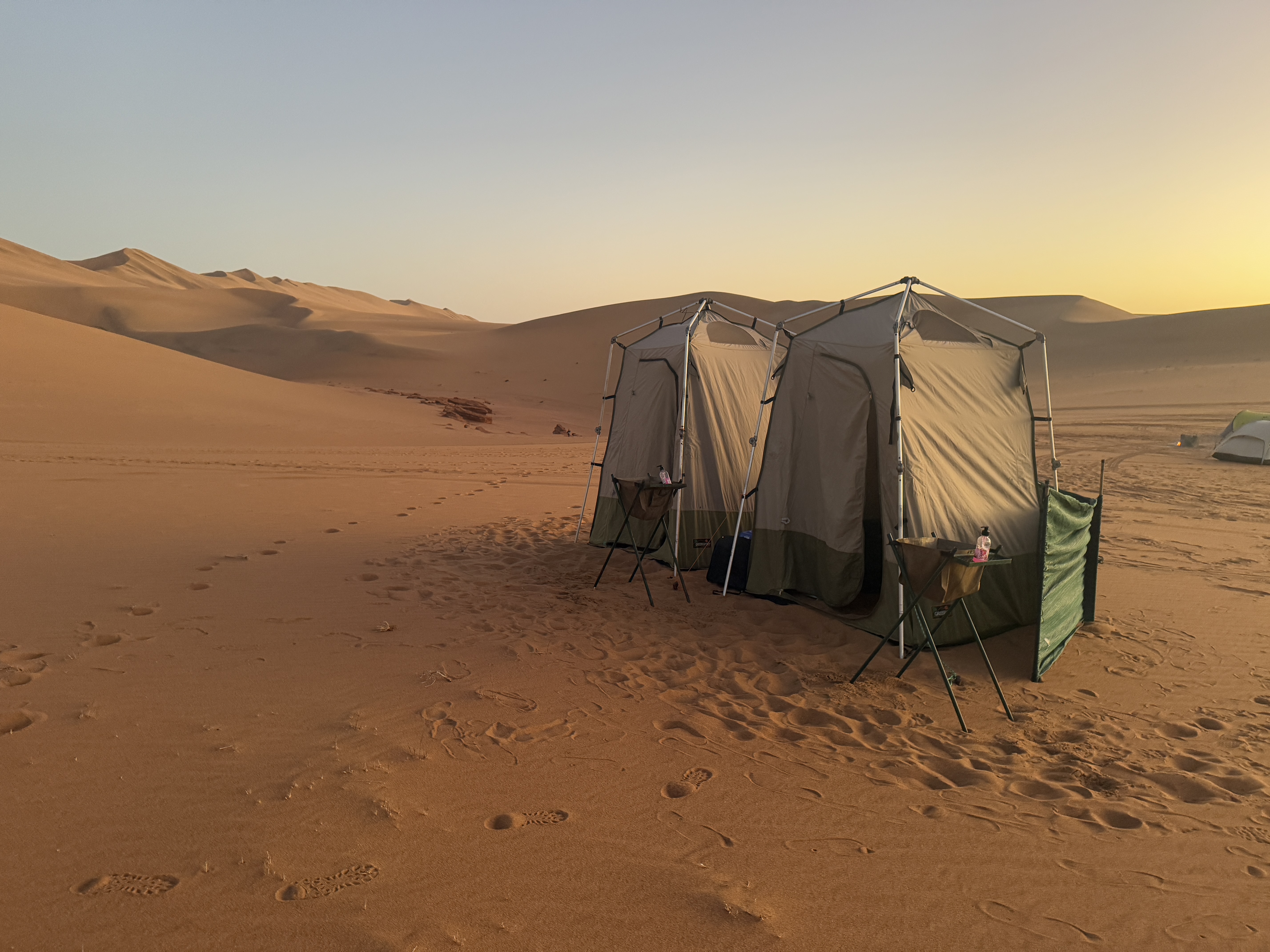 We set up proper sit down toilets at the pit-stops and the camps. As these are in the most spectacular places, we call them "loo with a view".